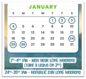 - The Hack: Jan 14 is a Holiday (Makar Sankranti). Take Leaves on Jan 15 & 16.