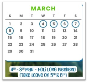 - The Hack: Holi is on Wednesday (Mar 4). Take Leaves on Mar 2 (Mon) & Mar 3 (Tue).