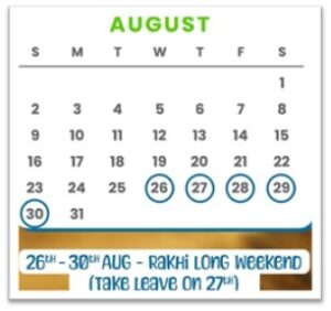 - Aug 28 (Fri): Holiday (Raksha Bandhan).